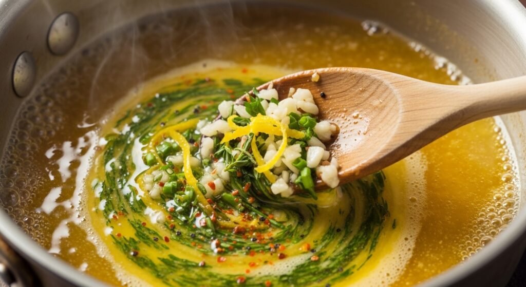 After that, add the minced garlic and stir for a minute until it smells fragrant but not brown. Garlic cooks fast, so watch it carefully. Next, stir in the lemon juice and zest. This brightens the butter and adds a fresh lift. Then mix in the Dijon mustard and a splash of Worcestershire sauce. These two bring tangy and savory notes that make the sauce taste layered and interesting.